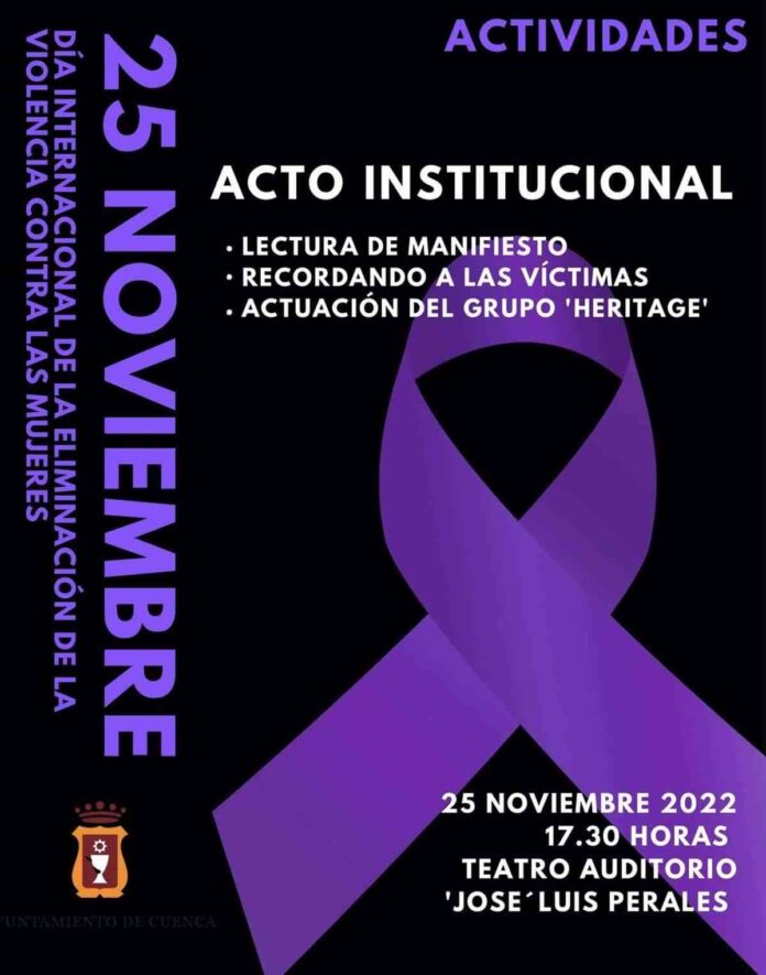 El equipo de Gobierno en el Ayuntamiento de Cuenca ha invitado a toda la ciudadanía a participar en el acto institucional con motivo del Día Internacional para la Eliminación de la Violencia Contra la Mujeres que tendrá lugar el viernes 25 de noviembre a las 17.30 horas en el Teatro-Auditorio ‘José Luis Perales’.