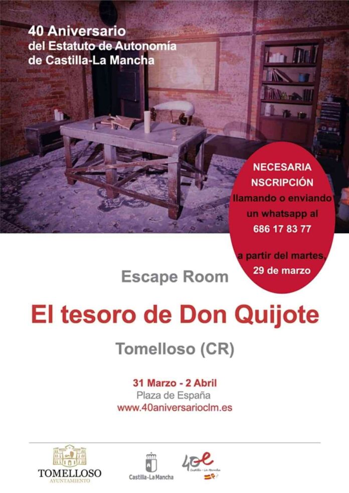 El escape room “El Tesoro del Quijote” llega este fin de semana a la Plaza de España de Tomelloso (Ciudad Real). Esta es una de las 300 actividades culturales que se van a desarrollar en toda la región con motivo de la celebración del 40 aniversario del Estatuto de Autonomía de Castilla-La Mancha.