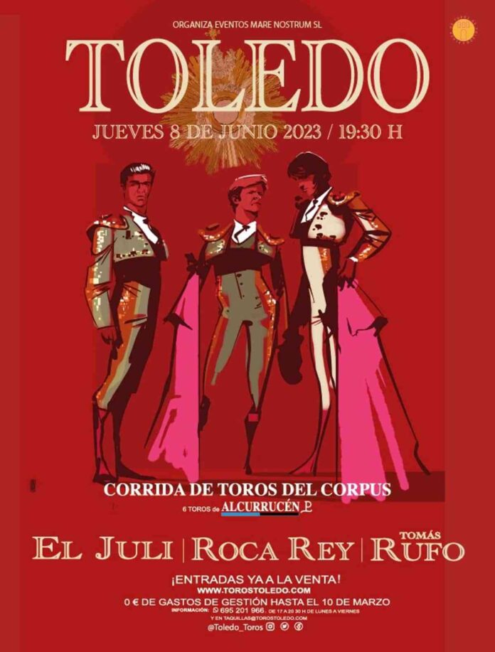 Se lidiará un encierro con el hierro toledano de Alcurrucén, ganadería sinónimo de garantía de grandes triunfos, organizado por la empresa Mare Nostrum en este su segundo año al frente del coso de la ciudad imperial, sociedad comandada por Nacho Lloret, con Luis María Garrido como gerente. La temporada toledana tendrá continuidad con un festejo sin caballos para las fiestas de agosto y una corrida de toros.