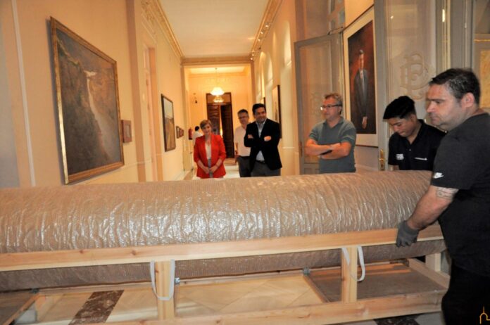 Ha vuelto a casa el lienzo del Quijote de Ángel Andrade, un regreso que ha convertido una mañana estival como la de hoy, en una muy especial. Recordemos que el lienzo sufrió un infortunado desprendimiento de parte del techo del Salón de Recepciones del Palacio Provincial, donde había permanecido anclado casi 129 años.
