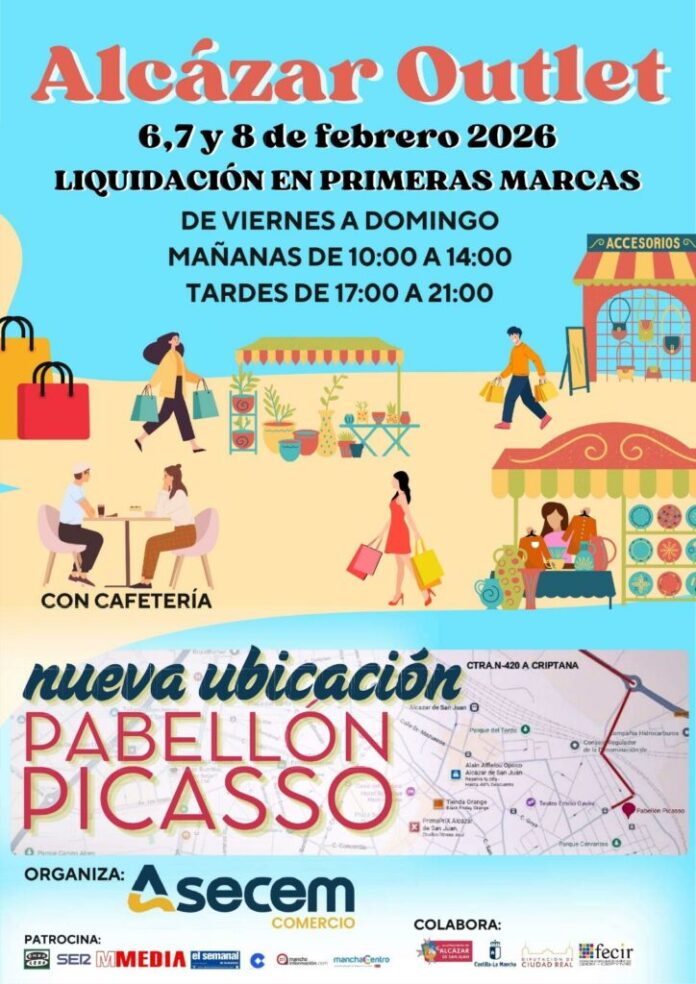 Organizado por la Asociación de Empresarios Centro Mancha (ASECEM) en colaboración con el Ayuntamiento de Alcázar de San Juan, la Junta de Comunidades de Castilla-La Mancha, la Diputación de Ciudad Real y FECIR, Alcázar Outlet ofrecerá durante todo el fin de semana una amplia gama de productos de primeras marcas con importantes descuentos, abarcando distintos sectores comerciales. El evento se desarrollará de 10:00 a 14:00 horas y de 17:00 a 21:00 horas.