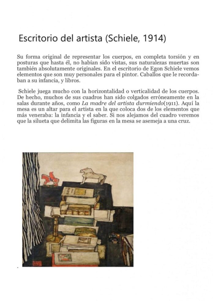 «Escritorio del artista» no es solo un retrato de un espacio físico, sino una puerta a la mente y la esencia de Egon Schiele. Los libros juegan un papel crucial, simbolizando el constante flujo de ideas e influencias que alimentaban su proceso creativo. A través de su arte, Schiele invita al espectador a un recorrido por su universo, donde cada objeto refleja una parte de su identidad y su visión del mundo.