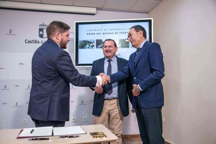 El Gobierno de Castilla-La Mancha va a remodelar el Paseo del Bosque de Puertollano en dos fases y las obras, que comenzarán el mes de julio, tienen un plazo de ejecución de 10 meses. El consejero de Fomento, Nacho Hernando, ha firmado junto con el alcalde de Puertollano, Adolfo Muñiz; y el consejero de delegado de la empresa que ejecutará las obras Construcciones Sarrión, Abraham Sarrión, el contrato de las obras de remodelación del Paseo del Bosque de Puertollano.
