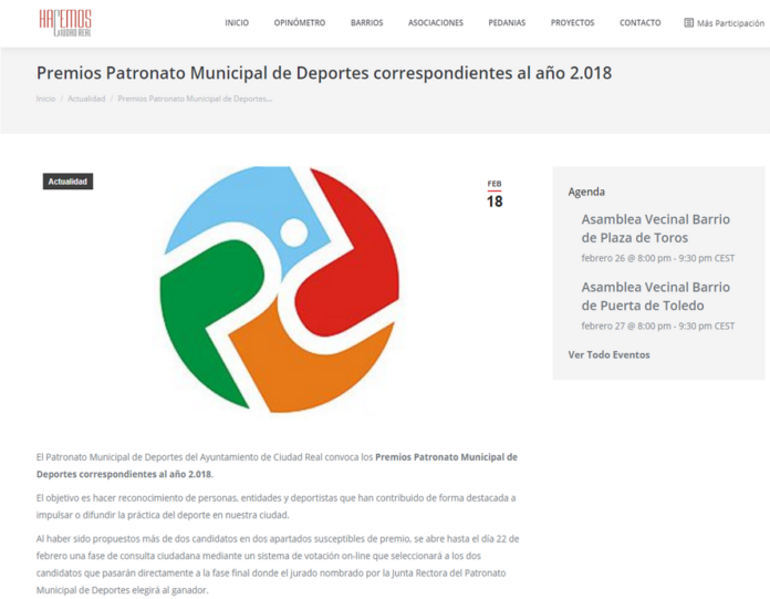 El Patronato Municipal de Deportes del Ayuntamiento de Ciudad Real ha abierto la votación on-line que seleccionará a los candidatos de dos candidaturas para los Premios Patronato Municipal de Deportes correspondientes al año 2.018.