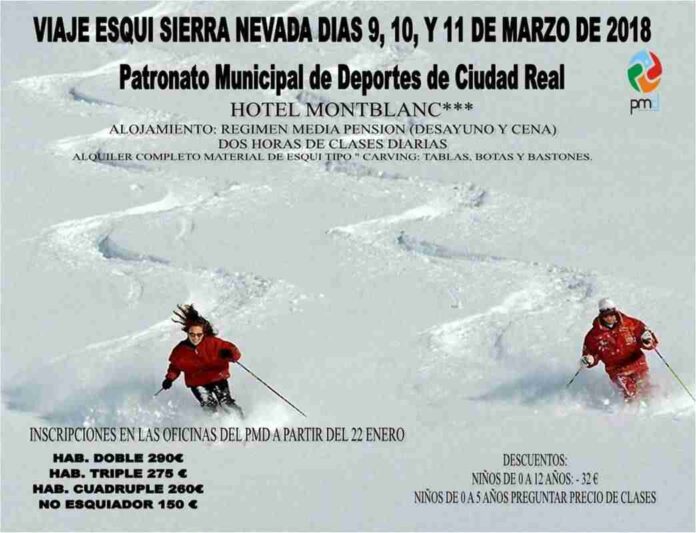 El Patronato Municipal de Deportes abre este lunes 22 de enero el plazo de inscripción para participar en el viaje a Sierra Nevada para realizar la práctica del esquí el fin de semana del 9 al 11 de marzo.