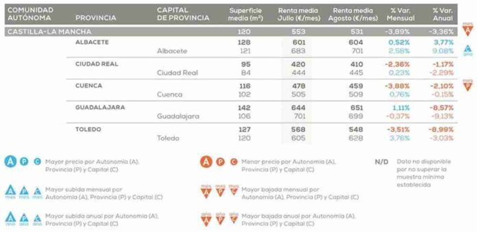 El piso tipo de alquiler en Castilla-La Mancha, registró en agosto de 2020 una superficie media de 120 metros cuadrados. Y una renta media de 531 euros. El descenso mensual fue de -3.89%, el más intenso del país. Respecto a agosto de 2019, el recorte fue del -3.36%, el tercero más pronunciado a nivel nacional. Estos datos según el informe mensual de precios de alquiler de pisos.com.