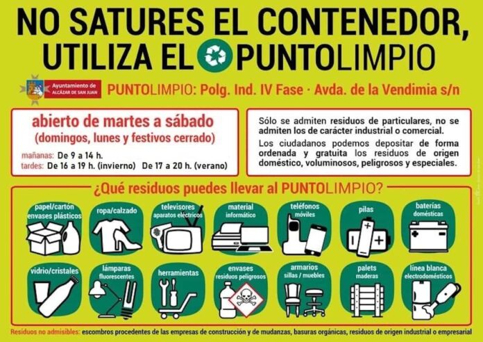 El ayuntamiento de Alcázar de San Juan, a través de la concejalía de Medio Ambiente pone en conocimiento que el Punto Limpio permanecerá cerrado los días sábado 27, domingo 28 y lunes 29 de marzo.