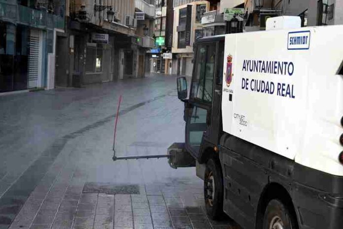 El Servicio de Limpieza del Ayuntamiento de Ciudad Real ya se encuentra desinfectando las calles y los lugares con mayor afluencia de personas, para tratar de frenar la expansión del COVID-19. Así una decena de operarios, ayudantes y el oficial coordinador se encuentran realizando baldeos mecánicos de zonas peatonales, y también baldeos manuales con agua a presión y desinfectante en las entradas a centro sanitarios, centros comerciales, tiendas de alimentación, y otros centros que pueden tener una cierta asistencia de público.