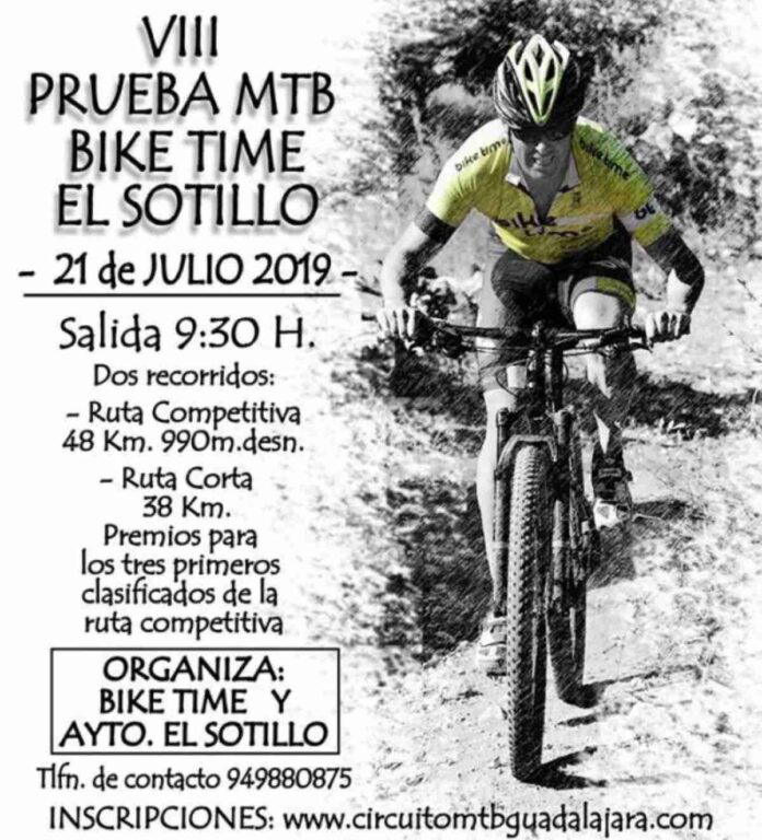 La VIII Prueba MTB Bike Time-El Sotillo se celebrará este domingo 21 de julio a las 9:30 horas en El Sotillo (Guadalajara). La carrera es puntuable para el Circuito MTB Diputación Guadalajara. Esta prueba ha sido organizada por el Club Ciclista Bike Time Guadalajara y el Ayuntamiento de la localidad. La prueba tendrá dos recorridos, uno largo y competitivo de 48 kilómetros y otro recorrido corto de 38 km.