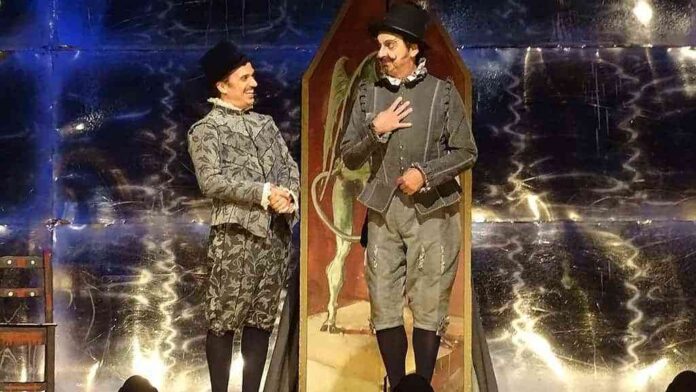 Por otro lado, el miércoles 17 de agosto era el turno de la obra “La escuela de los vicios” de Morfeo Teatro. Los discursos más controvertidos de Quevedo. Un espectáculo políticamente incorrecto. Se trata de un montaje basado en las sátiras y discursos políticos del genio del Siglo de Oro. Un concentrado de la mejor insolencia de Quevedo, escritos que en su momento lograron gran éxito, provocando diversas polémicas, entre las que no faltaron acusaciones de obra sediciosa. La obra presenta a un extravagante diablo esperando a dos necios a los que espera cautivar con su «escuela de los vicios», la única en que los alumnos cobran por aprender. Las titulaciones serán: bachiller en mentir, licenciado en engañar, doctor en robar y catedrático en medrar. Los dos necios, tras una inicial reticencia al ver que es el diablo quien imparte las clases, se meten de lleno en el aprendizaje por el generoso acuerdo propuesto, consiguiendo excelentes resultados, y mucho más allá de sus expectativas, al ser nombrados Ministro y Magistrado respectivamente, aunque el diablo tiene una última y sorprendente enseñanza.