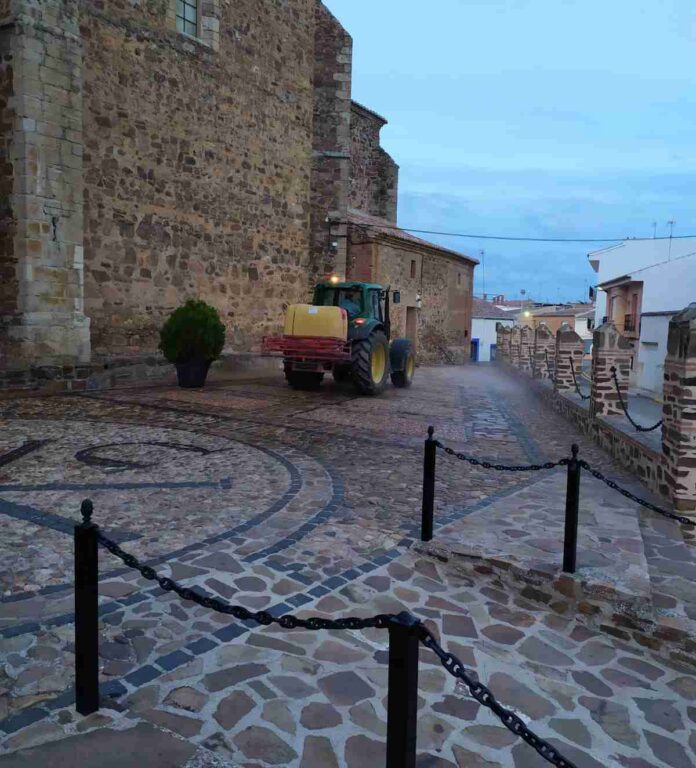 Raúl Pisa, teniente del alcalde y concejal de Turismo, ha destacado la implicación de los agricultores. Quienes están utilizando sus tractores y atomizadores para aplicar los productos de limpieza por todos los rincones del pueblo. En una tarea intensa de desinfección de sus calles.