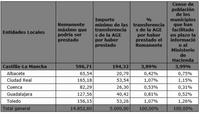 194 millones de euros recibirían las entidades locales de Castilla-La Mancha por la cesión de los remanentes. Así lo han dado a conocer a través de un informe, los técnicos del Ministerio de Hacienda (Gestha).