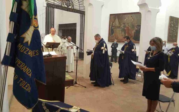 En presencia de la primera edil de Toledo, Doña Milagros Tolón, la Presidenta del Brazo de Damas Mozárabes, Doña Laura Gutiérrez y una representación del Cabildo de la Hermandad, respetando el aforo máximo de 40 personas y las medidas higiénico-sanitarias aconsejadas por las autoridades, Don Antonio Muñoz Perea en su condición de Hermano Mayor procedió a la ofrenda y entrega del Collar de la Hermandad de Caballeros y damas Mozárabes a Mons. D. Francisco Cerro.