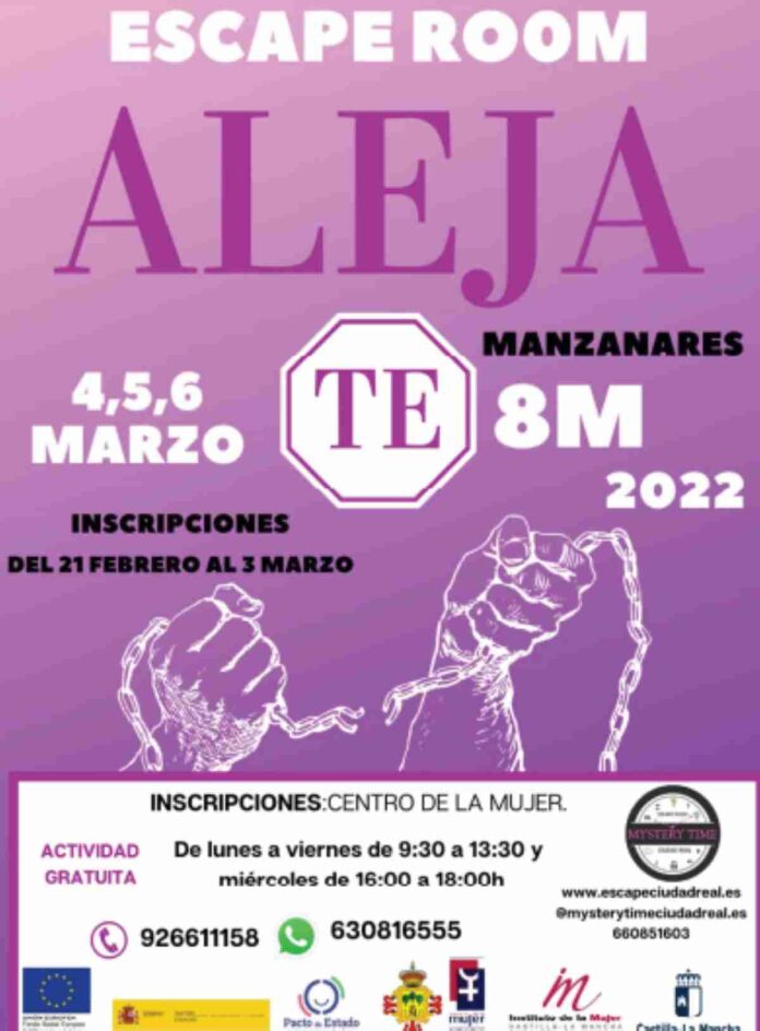 Ya puedes inscribirte en el Escape Room Aleja que se llevará a cabo los días, 4, 5 y 6 de marzo en el Centro de la Mujer de Manzanares (Ciudad Real). Las inscripciones se realizan desde el pasado 1 de febrero y hasta el 3 de marzo.