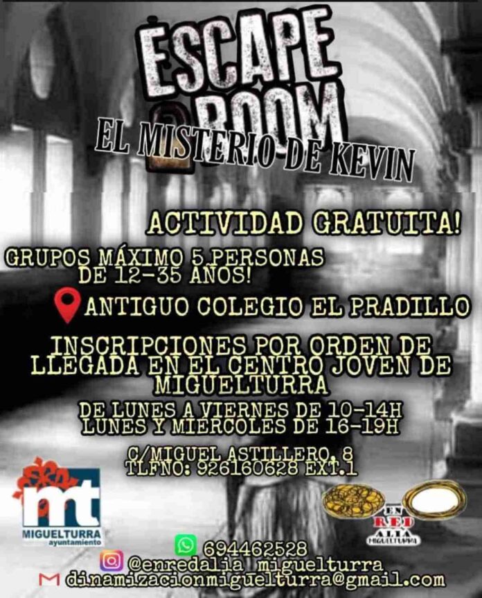 Un “Escape Room” denominado “El misterio de Kevin” organiza el Centro Joven de Miguelturra (Ciudad Real). Esta actividad es gratuita y está destinada a los jóvenes en edades entre 12 y 35 años. El mismo se realizará con grupos máximos de 5 personas. Y tendrá lugar en el antiguo colegio El Pradillo.