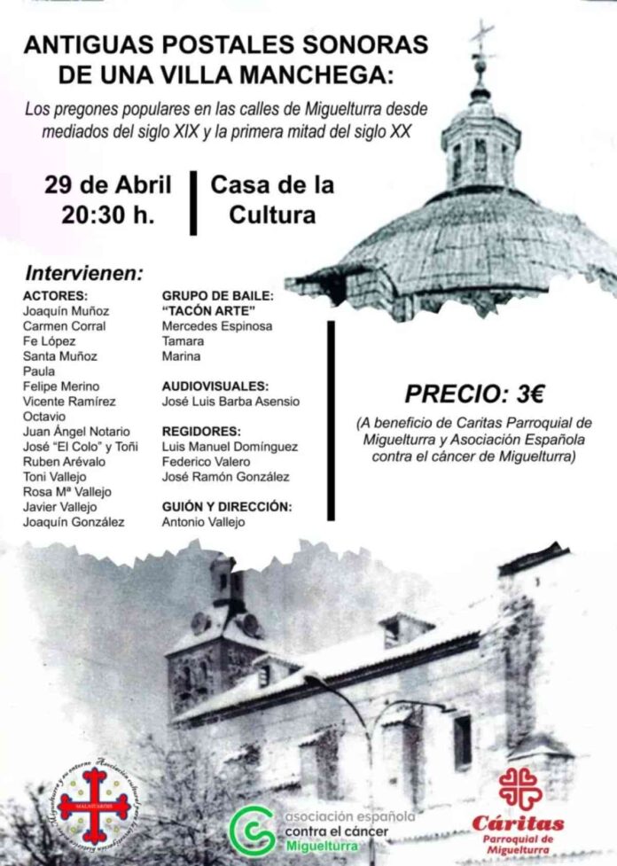 “Antiguas Postales Sonoras de una Villa Manchega” es el espectáculo que podrá disfrutarse este 29 de abril a las 20:30 horas en la Casa de la Cultura de Miguelturra (Ciudad Real). Una puesta en escena, un tanto cómica, refieren los organizadores, que hará a los presentes recordar, o en su caso conocer, el habitual ambiente sonoro de las calles y plazas de nuestro entorno (en un periodo más o menos comprendido entre 1860 a 1960).