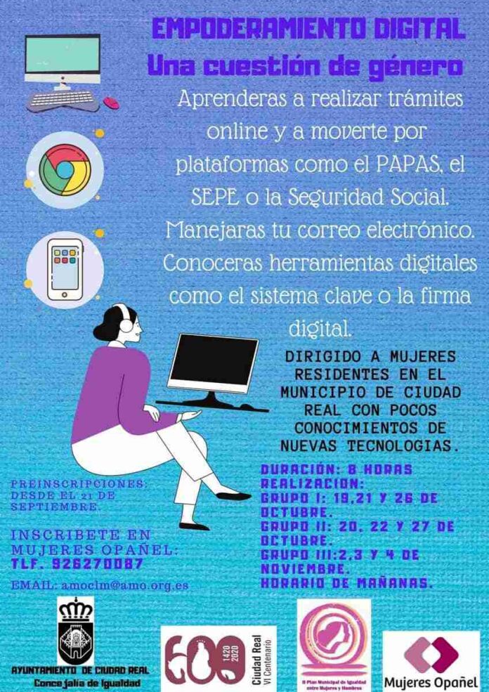 Este lunes, 21 de septiembre, se abrirá el plazo de inscripción para el curso de “Empoderamiento Digital. Una cuestión de género” organizado por la Concejalía de Igualdad del Ayuntamiento de Ciudad Real. Se trata de una formación destinada a personas que carezcan o quieren mejorar en sus competencias digitales, ofreciéndoles diversas herramientas útiles que les permitan conocer trámites y gestiones que pueden llevar a cabo de forma “on-line”.