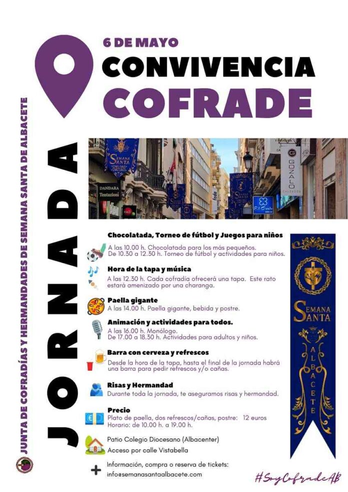 La Junta de Cofradías y Hermandades de Semana Santa de Albacete celebra este sábado, 6 de mayo, la primera Jornada de Convivencia Cofrade una vez finalizada la Semana Santa, y cuando se está celebrando la Pascua de Resurrección del Señor con el fin de pasar un día entre los cofrades de las distintas hermandades y personas cercanas a nuestra semana de pasión.