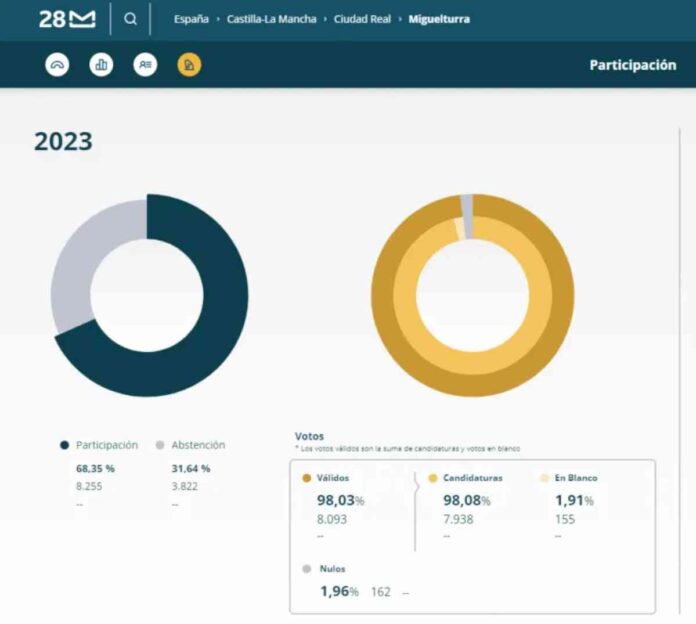 Estos son los datos electorales resultados, luego de haberse escrutado el 100 por 100 ciento, de los comicios locales del 28 de mayo de 2023. Según información de la web oficial del Ministerio del Interior https://resultados.locales2023.es con respecto a Miguelturra (Ciudad Real).