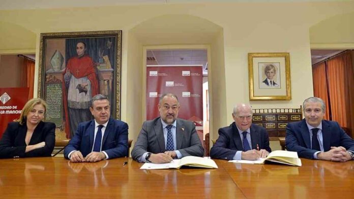 En el acto de firma de convenio el rector de la UCLM y el decano del Colegio de Abogados de Ciudad Real han estado acompañados por el decano de la Facultad de Derecho y Ciencias Sociales del Campus de Ciudad Real, Fernando Callejas; la vicerrectora de Innovación, Empleo y Emprendimiento, Ángela González; y el vicedecano del Colegio de Abogados de Ciudad Real, Óscar Ruiz.