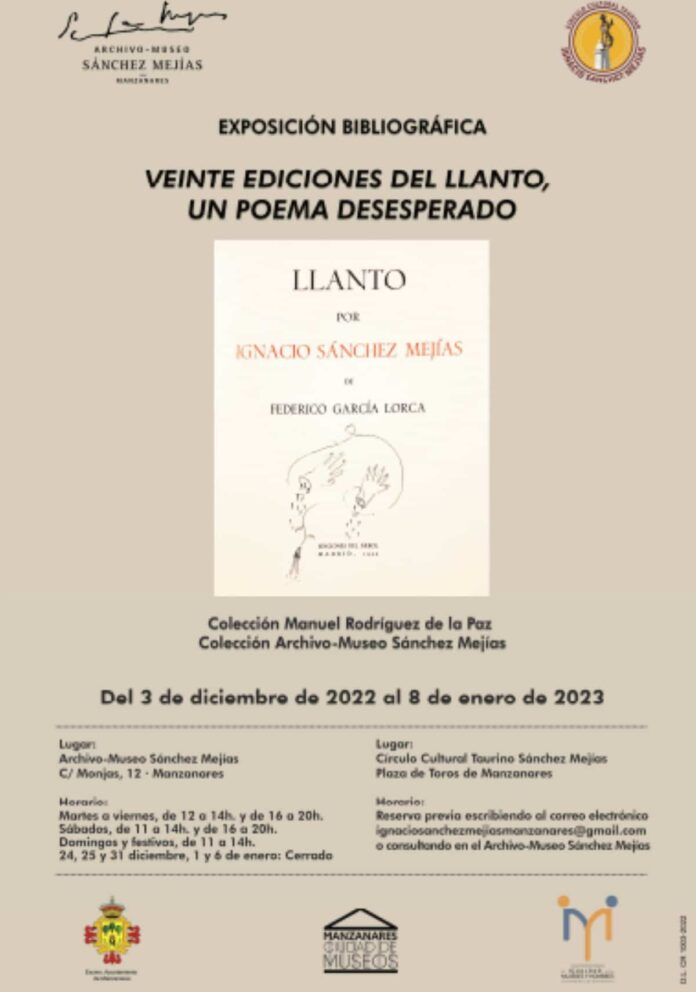 La exposición bibliográfica “Veinte ediciones del llanto, un poema desesperado” de la Colección Manuel Rodríguez de la Paz, Colección Archivo-Museo Sánchez Mejías de Manzanares (Ciudad Real) está abierta al público desde el 3 de diciembre y hasta el próximo 8 de enero del 2023.