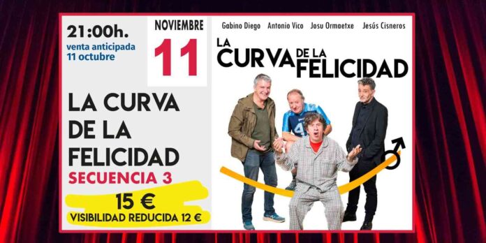 La Curva de la Felicidad se podrá disfrutar el próximo viernes 11 de noviembre a las 21h en el Teatro Emilio Gavira. El precio de las entradas es de 15 € la entrada general, 12 € la entrada de baja visibilidad. Se pueden adquirir en taquilla y Giglon.