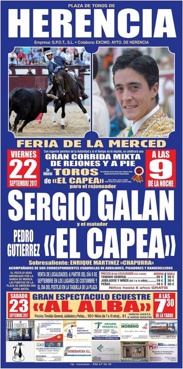 El próximo viernes 22 de septiembre de 2017 a las 21:00 horas tendrá lugar la Gran Corrida mixta de rejones y a pie con motivo de la Feria de la Merced de Herencia (Ciudad Real).