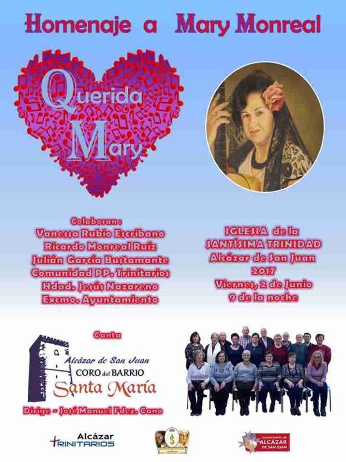 Hoy viernes, 2 de junio de 2017, a las 21:00 horas en la Iglesia de la Santísima Trinidad de Alcázar de San Juan (Ciudad Real) y dentro de los actos públicos, no de culto, de la Pascua de Pentecostés o Pascua de Jesús, como tradicionalmente se conocer en nuestra localidad, tendrá lugar un Homenaje a Mary Monreal.