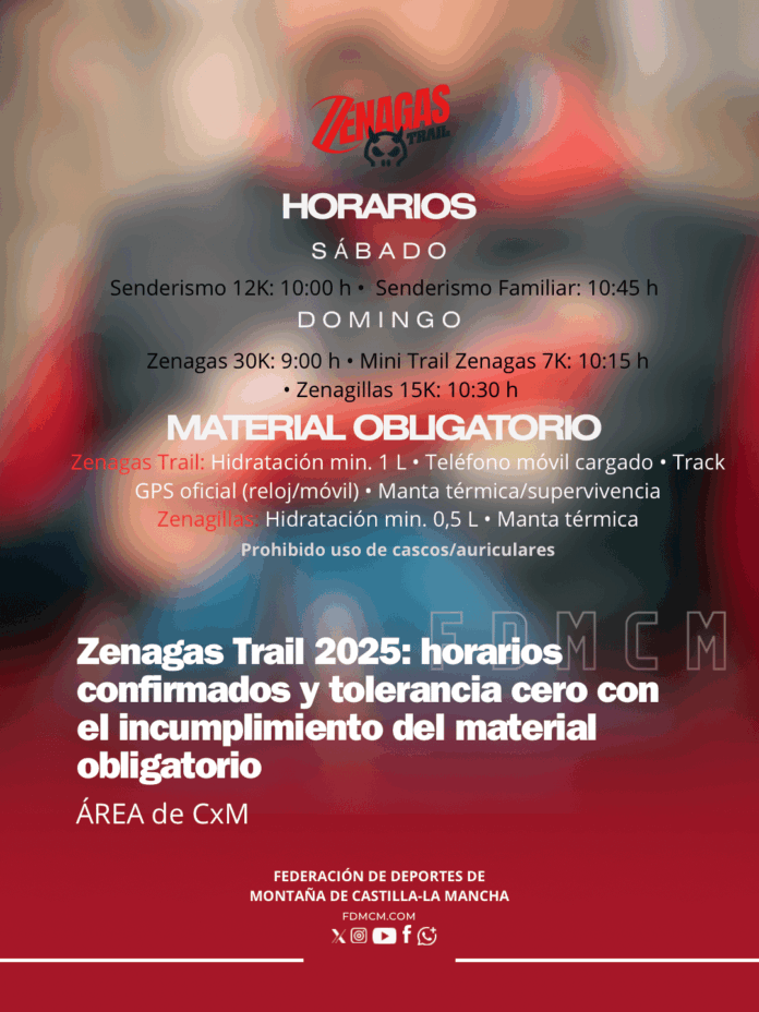 El fin de semana del 8 y 9 de noviembre se llevará a cabo la última prueba de la Copa de Carreras por Montaña en Castilla-La Mancha, conocida como Zenagas Trail. La Federación de Deportes de Montaña de Castilla-La Mancha (FDMCM) ha emitido un comunicado para informar a los participantes, clubes y medios de comunicación sobre las directrices de seguridad, el material obligatorio y los horarios oficiales, con el fin de garantizar la integridad de los corredores y fomentar un ambiente de competición equitativa.