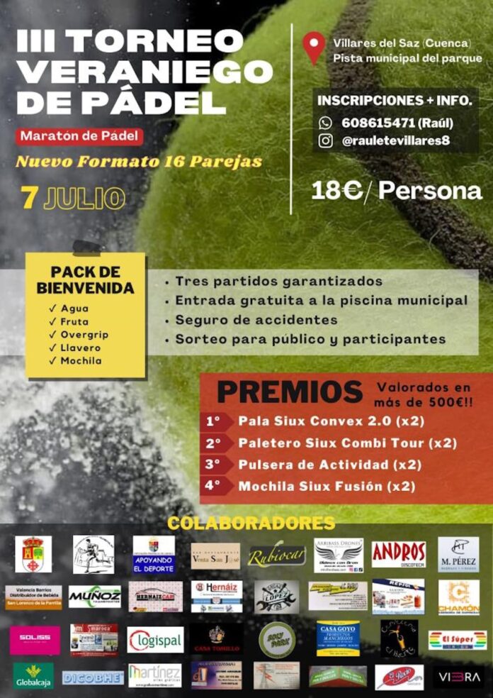 El 7 de julio será el III Torneo Veraniego Villares del Saz Maratón de Pádel por parejas con nuevo formato. Organizado por el Club Deportivo Santa Eulalia.