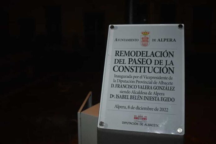 Se ha inaugurado en Alpera, su Paseo de la Constitución, con un acto oficial en el que ha estado presente, el vicepresidente de la Diputación Provincial de Albacete, Fran Valera, junto a la alcaldesa de la localidad, Isabel Belén Iniesta, diferentes ediles municipales, y numeroso público deseoso de disfrutar del resultado final de una obra que ha contado para su desarrollo con una importante aportación económica por parte de la Diputación Provincial de Albacete (a través de dos anualidades del POS) y con un gran esfuerzo por parte del Ayuntamiento.