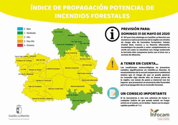 Desde el Geacam nos informan de la previsión para este domingo 31 de mayo de 2020. El Índice de Propagación Potecial (IPP) de indencio forestarales para este dominog en Castilla-La Mancha nos muestra a cuatro provincias de la región con niveles de riesgo alto: Toledo, Ciudad Real, Cuenta y La Mancha albaceteña.