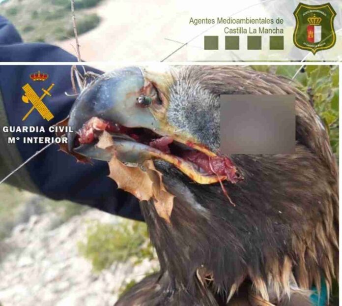 Es que, la Guardia Civil en nota de prensa, informó de la supuesta detención del presunto autor de un delito contra la fauna, luego de ser localizado el cadáver de un águila real presuntamente envenenada, así como varios zorros y conejos muertos por medios ilícitos. La nota de prensa enviada desde el instituto armado está ilustrada con al menos una fotografía en primer plano del cadáver donde puede verse en forma exclusiva el escudo del cuerpo.