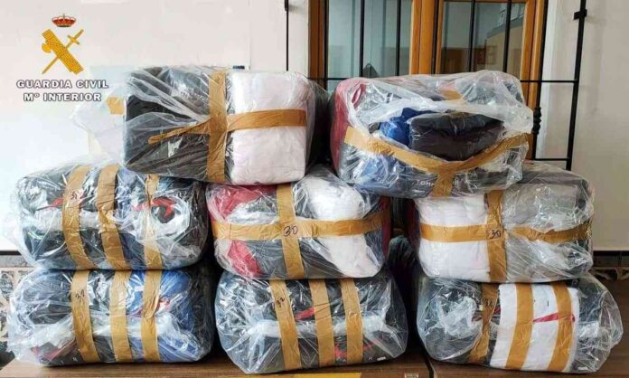 En ese preciso momento, los agentes de la Guardia Civil que seguían el envío identificaron al receptor de la mercancía, siendo requerido para que mostrara el contenido de los cuatro bultos que acaba de recibir, comprobando tras su desembalaje que conformaban ocho paquetes que contenían un total de 248 prendas de vestir, concretamente sudaderas, supuestamente réplicas de una marca registrada, que a simple vista generaban serias dudas sobre su autenticidad.