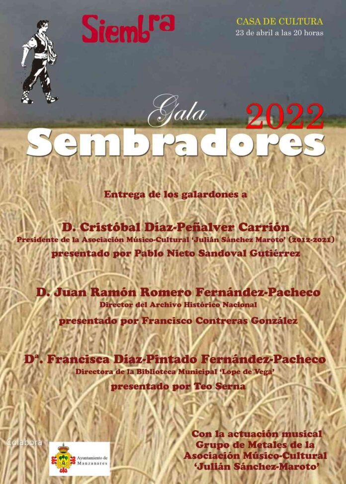 La gala ‘Sembradores 2022’ se celebrará este sábado en la Casa de Cultura de Manzanares (Ciudad Real) a las 20:00 horas con entrada gratuita y hasta completar aforo. La gala de ‘Siembra’ cuenta con el patrocinio y el apoyo del ayuntamiento de la localidad.