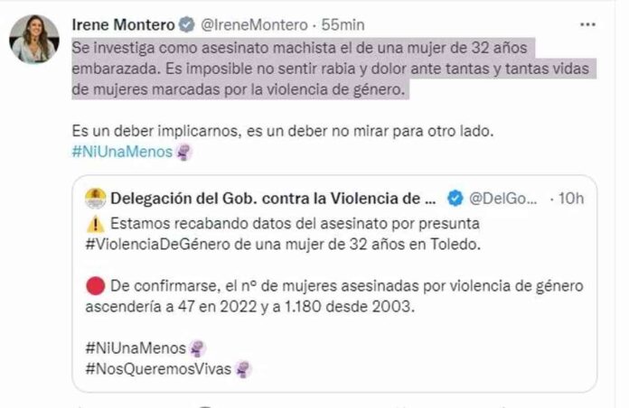 La ministra de Igualdad, Irene Montero, ha asegurado «sentir rabia y dolor» ante «tantas y tantas vidas de mujeres marcadas por la violencia de género», tras el asesinato de una mujer de 32 años embarazada en la localidad de Escalona (Toledo) que está siendo investigado como crimen machista.