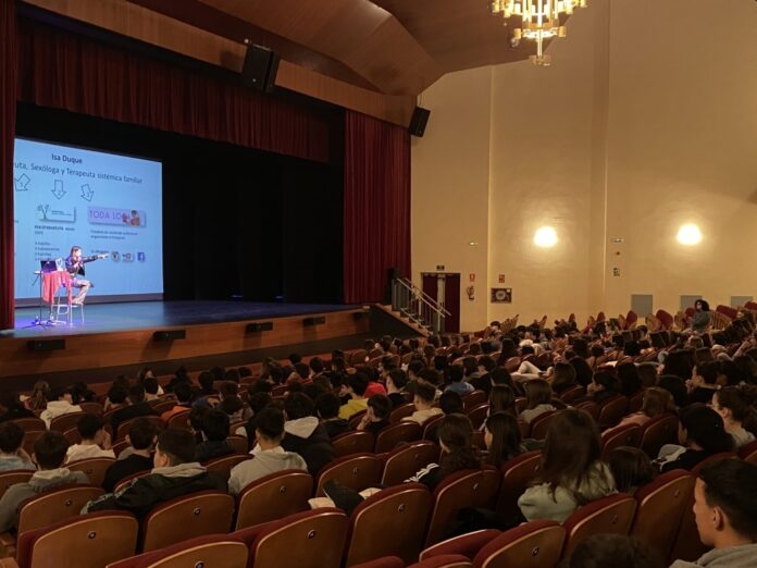 En el marco de los actos con motivo del 25N, Día Internacional Contra la Violencia Hacia las Mujeres, esta mañana el Teatro Emilio Gavira ha acogido la charla formativa «Viva el amor del bueno», impartida por la psicóloga, sexóloga y ciberactivista Isabel Duque, más conocida por su pseudónimo ‘La Psicowoman’. Las concejalas Patricia Benito y Cristina Perea han acompañado a la divulgadora en este encuentro orientado hacia el público adolescente, con la presencia del alumnado de 3º y 4º de la ESO de los centros educativos de Alcázar de San Juan.