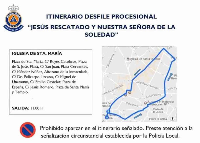 Desde Protección Civil de Alcázar de San Juan nos recuerdan que se prohíbe el estacionamiento en dicho itinerario. Preste atención a la señalización circunstancial y prevea itinerarios alternativos ya que se producirán cortes de tráfico en las calles de paso de la procesión.