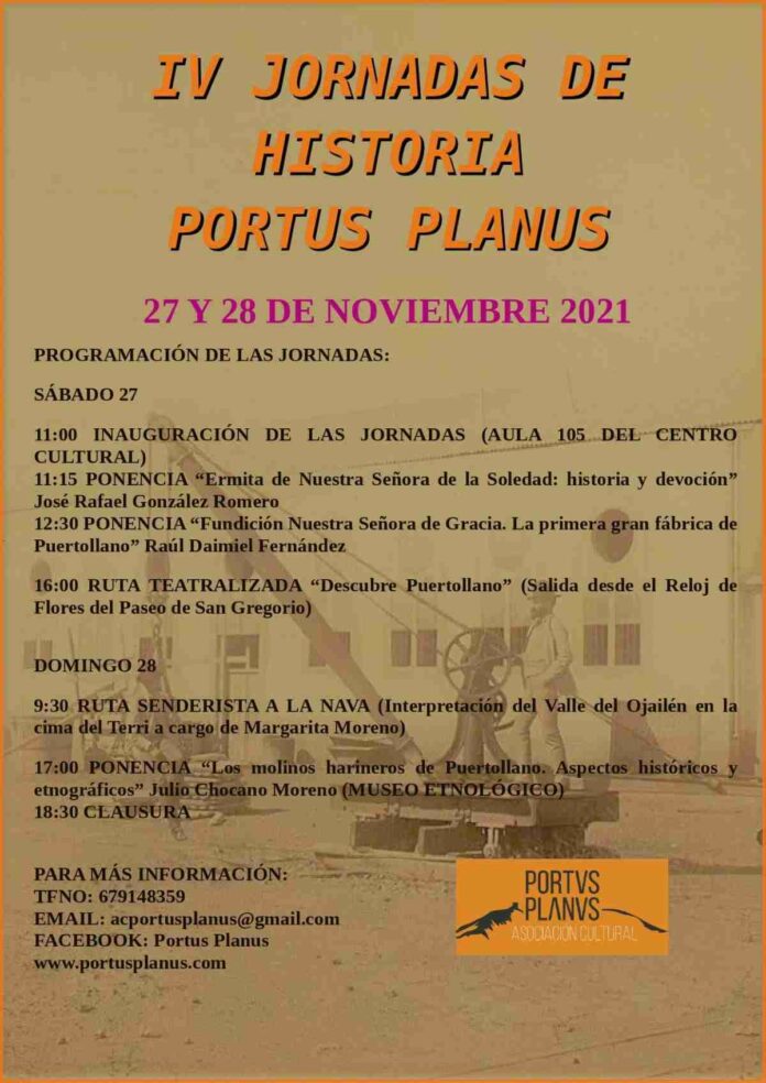 Las IV jornadas de historia de Portus Planus se celebrarán los días 27 y 28 de noviembre y en las que los estudios de investigación que se presentarán serán sobre la Ermita de la Virgen de la Soledad, antiguas fundiciones y los molinos harineros.