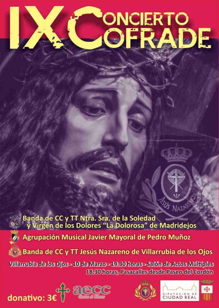 El Salón de Usos Múltiples de Villarrubia de los Ojos (Ciudad Real) acogerá, el próximo sábado 10 de marzo a las 19:30 horas, el IX Concierto Cofrade de la Banda de Cornetas y Tambores Jesús Nazareno de Villarrubia de los Ojos.