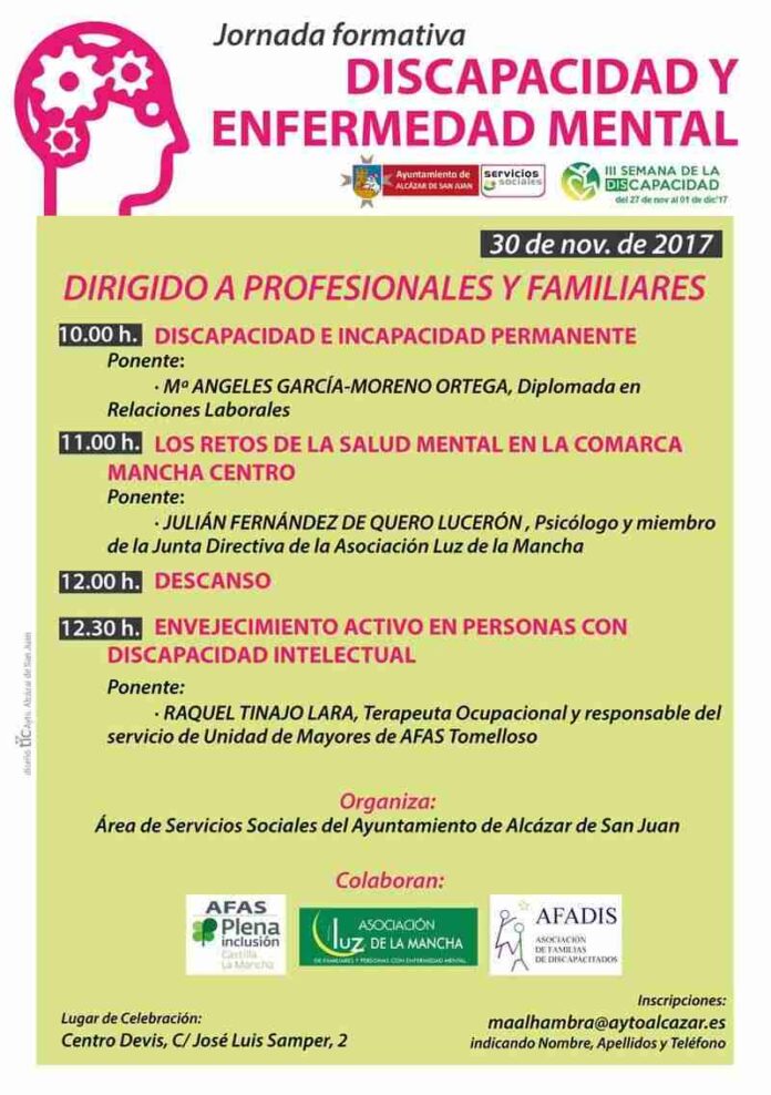 Con motivo del Día Internacional de las Personas con Discapacidad, que se conmemora el 3 de diciembre de cada año, desde el área de Servicios Sociales del Ayuntamiento de Alcázar en colaboración con AFAS, Asociación Luz de la Mancha y AFADIS se ha organizado las jornadas «Discapacidad y Enfermedad Mental» que tendrán lugar el próximo día 30 noviembre.