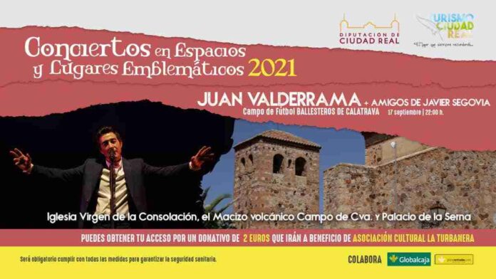 Los conciertos en Espacios y Lugares Emblemáticos presentarán a Juan Valderrama + Los amigos de Javier Segovia en el campo de fútbol de Ballesteros de Calatrava (Ciudad Real) el 17 de septiembre a las 22 horas. Una cita con la música en el entorno de un rincón maravilloso de Castilla-La Mancha.