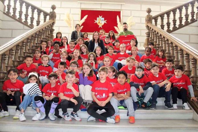 El encuentro con la regidora ha finalizado como es habitual en las visitas de escolares, con una foto de familia en las escaleras del Ayuntamiento portando las camisetas rojas de #EsAlcázar.