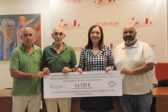 El pasad jueves, la alcaldesa Rosa Melchor ha entregado a Enrique Lubián, presidente de la Asociación Española Contra el Cáncer (AECC) en Alcázar de San Juan, el talón nominativo de lo recaudado en la VII Carrera de la Mujer, que ha sido todo un éxito en cuanto a recaudación y donaciones de empresas. La cuantía, que asciende a los 14.535 euros, supera en 4.500 euros a la cifra recaudada en la edición del año pasado, una evolución nada desdeñable.