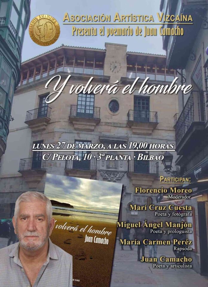 En el marco del programa de Lecturas Comentadas de los nuevos libros publicados por integrantes de la cuasi octogenaria Asociación Artística Vizcaína, que en este su primer ciclo, correspondiente al curso académico 2022-2023, ya ha superado los ocho títulos. A las 19:00 horas del lunes 27 de marzo de 2023, en el Centro Cívico ‘La Bolsa’ de la calle Pelota nº10 del Casco Viejo de Bilbao, y con entrada libre, tendrá lugar la lectura comentada del poemario ‘Y volverá el hombre’ de Juan Camacho, publicado por Ediciones C&G , con la presencia del autor, la moderación a cargo del coordinador del ciclo, Florencio Moneo, y la intervención de Mari Cruz Cuesta (poeta y fotógrafa), Miguel Ángel Manjón (poeta prologuista del libro) y Mari Carmen Pérez (rapsoda).