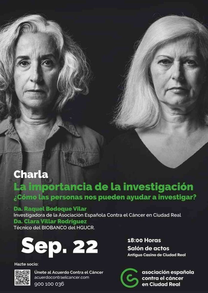 La Sede Provincial de Ciudad Real junto con la concejalía de Educación de Ciudad Real, realizarán una exposición durante los días 20, 21 y 22 de Septiembre en el Antiguo Casino de Ciudad Real sobre los 50 años de investigación en Cáncer. Que concluirá con una charla sobre la “ Importancia de la Investigación” que llevará a cabo el día 22 de Septiembre a las 18.00 h en el Antiguo Casino una de las pre-doctorales de la Asociación, concretamente Raquel Bodoque, junto con la técnico del biobanco del HGUCR Clara Villar.