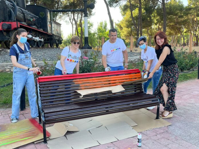 En un gesto de apoyo y solidaridad hacia el colectivo LGTBI+ y como parte de las actividades programadas en la Semana del Orgullo Manchego LGTBI+, la concejala de Asuntos Sociales Patricia Benito se unió a la Asociación Plural LGTBI Mancha Centro en la tarea de repintar los bancos de la Avenida de la Constitución que habían sido objeto de actos vandálicos.