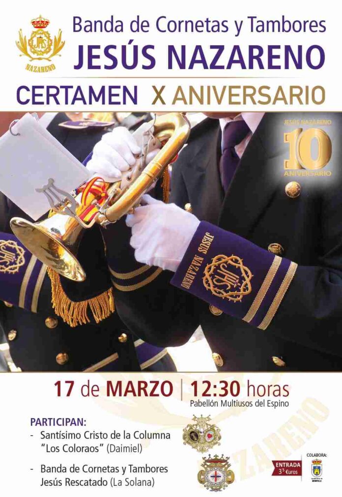 La Banda de Cornetas y Tambores Jesús Nazareno de Membrilla celebrará su X Aniversario con un concierto conmemorativo que tendrá lugar el próximo domingo 17 de marzo, a las 12:30 horas, en el Pabellón Ferial del Espino. La banda es la formación musical más joven de la localidady la única de la Semana Santa de Membrilla que se decantó por el estilo de cornetas y tambores. En estos diez años, la banda no ha dejado de crecer, en un continuo proceso de consolidación y evolución, tanto en su sonido, integrando nuevos instrumentos de viento-metal, como en su uniformidad, inspirada en el traje de gala de la armada española. En la actualidad, cuenta con cuarenta y cinco componentes cuyo principal valor es la juventud.