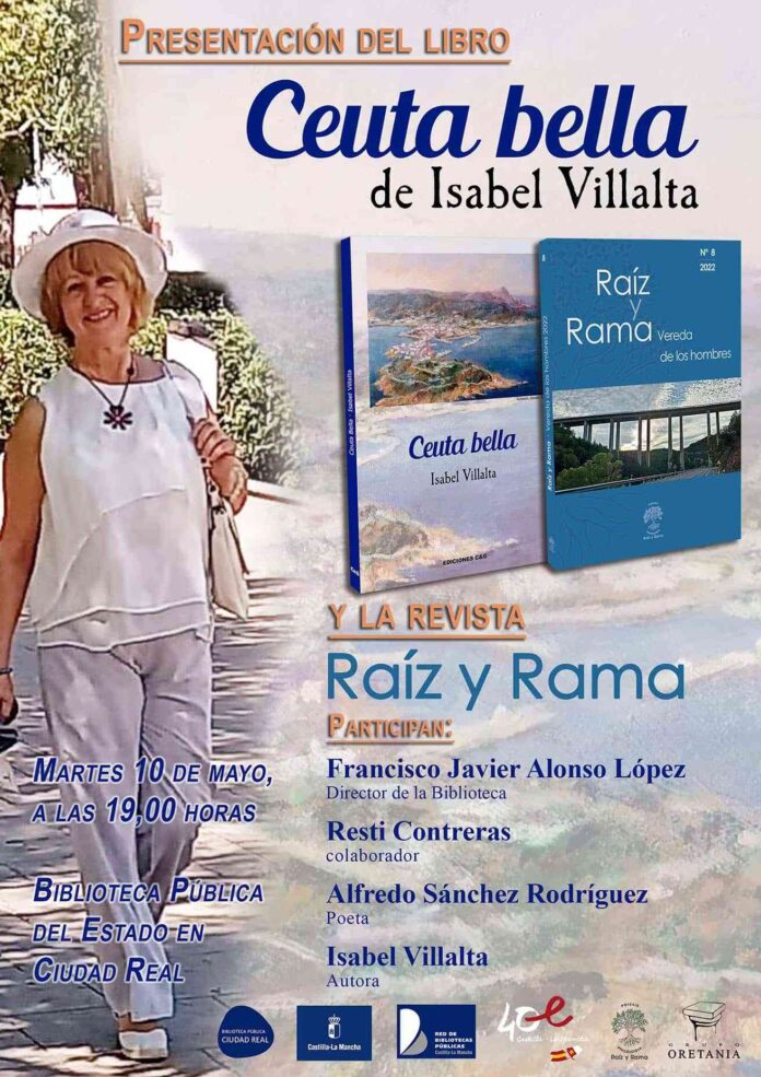 Hoy, martes 10 de mayo, a las 19,00 horas, se presentará en la Biblioteca Pública del Estado en Ciudad Real «Isabel Pérez Valera», un nuevo número de la revista ‘Raíz y Rama’ ‘Vereda de los Hombres’, publicación dirigida por Isabel Villalta, compuesta de interesantes artículos sobre diferentes disciplinas científicas escritos por colaboradores de reconocido prestigio y el poemario ‘Ceuta Bella’. que se gestó tras un viaje realizado por la poeta a la ciudad de Ceuta, en el que quedó prendada de la Perla del Mediterráneo.