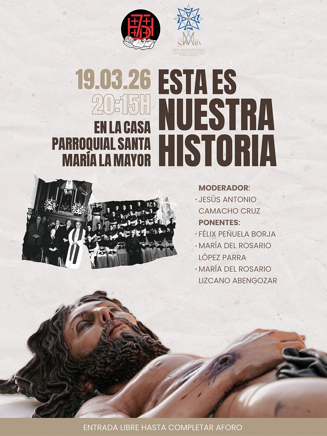 La Cofradía del Santo Entierro celebrará el próximo jueves 19 de marzo a las 20:15 horas una charla coloquio bajo el lema “Esta es nuestra historia” en la Casa Parroquial de la Parroquia de Santa María la Mayor. La actividad forma parte de los actos organizados para conmemorar el 75 aniversario de la hermandad y se desarrolla en colaboración con la parroquia dentro de las celebraciones de su VIII Centenario.